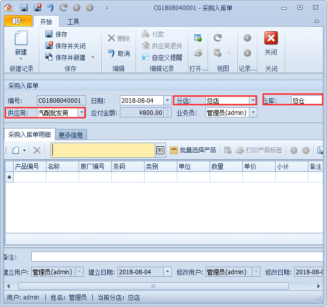 1、點擊【庫存管理】→【采購入庫單】→點擊菜單欄中“新建”進入采購入庫單中,首先選擇購入的門店和需要存放這批產(chǎn)品的倉庫,然后填入產(chǎn)品采購的供應商,如圖:
