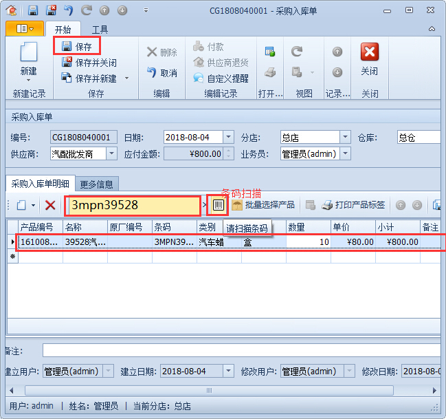 2、在采購入庫單明細中根據(jù)到貨單,掃描或輸入商品條碼將產(chǎn)品入庫,再將產(chǎn)品的數(shù)量填入系統(tǒng)中,保存即可。如圖: