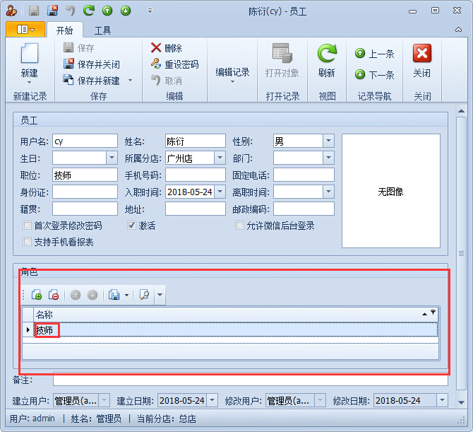 ①首先給員工賦予角色權(quán)限,不同的角色則是獲得不同角色操作權(quán)限,點(diǎn)擊【基礎(chǔ)資料】→【員工】在員工列表選擇需要設(shè)置權(quán)限的員工信息雙擊進(jìn)入員工詳細(xì)信息界面,在“角色”管理中選擇與該員工崗位相應(yīng)的角色,如圖: