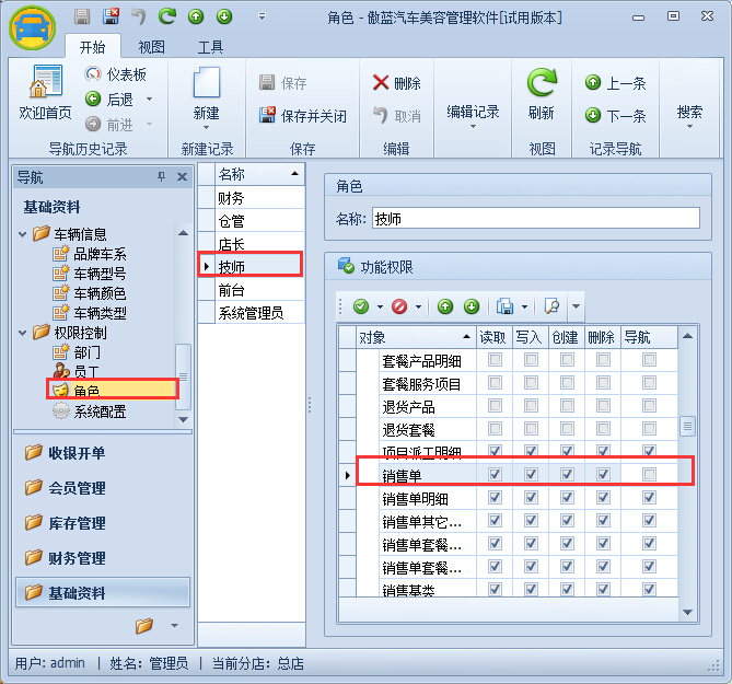 ②設(shè)置覺(jué)得的權(quán)限,設(shè)置①中該角色具體擁有的操作權(quán)限,在相應(yīng)的功能后面去掉“讀取、寫(xiě)入、刪除、導(dǎo)航”等內(nèi)容的√表示,該角色不能使用該功能的權(quán)限,如圖: