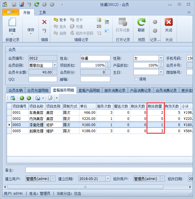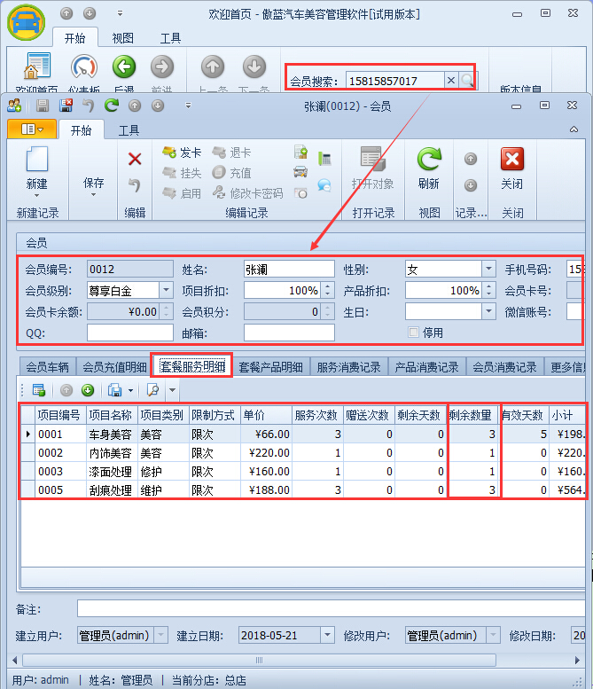 汽車美容店的會員到店消費已購買的套餐服務(wù),店員根據(jù)會員提供提供的電話號碼或姓名,在傲藍(lán)汽車美容軟件的搜索欄中快速搜索出會員資料,查看會員資料中剩余可以用的套餐服務(wù)次數(shù),如圖: