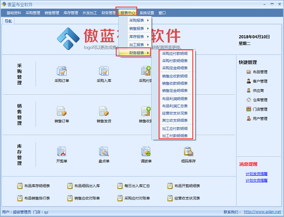 在傲藍布匹銷售管理軟件的財務管理模塊中做了很多財務管理的各種明細報表,比如:采購應付款明細、采購付款明細表、供應商訂金流水、銷售應收款明細、銷售收款明細表、客戶訂金流水賬、經(jīng)營收支狀況表、其他收支明細表、加工應付款明細、加工付款明細表;詳細的財務報表中心,通過各個財務明細報表了解客戶或供應商的收費情況及店鋪經(jīng)營的數(shù)據(jù)報表。
