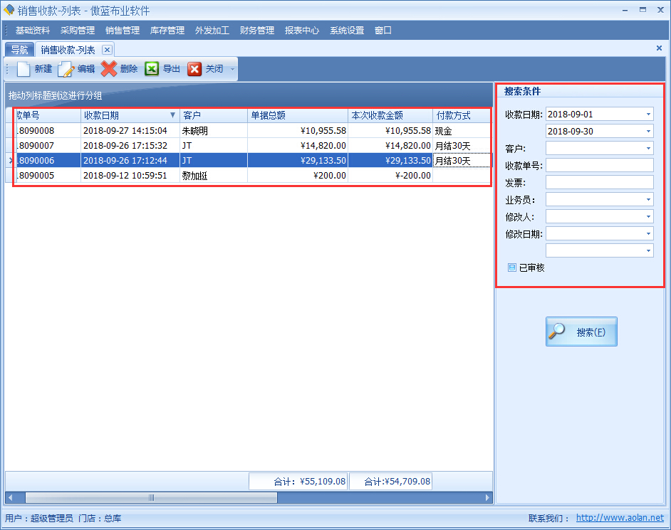 傲藍布匹銷售管理系統(tǒng)銷售收款實現(xiàn)自動引入單據(jù),多次收款