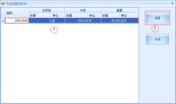 ○4 選擇一條庫存細(xì)碼數(shù)據(jù),做為開剪數(shù)據(jù)。