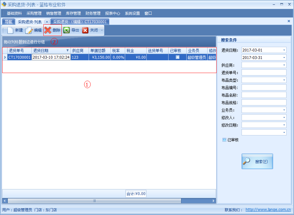 如需要對采購?fù)素浿心骋粭l數(shù)據(jù)進(jìn)行刪除的,通過采購?fù)素浟斜磉x中一條記錄點擊【刪除】按鈕,刪