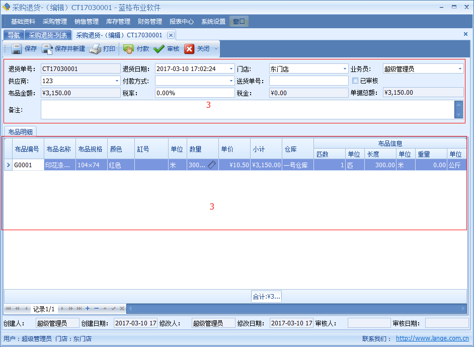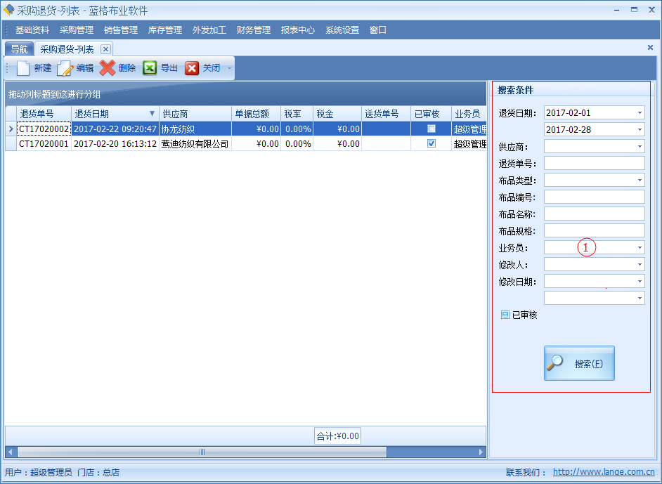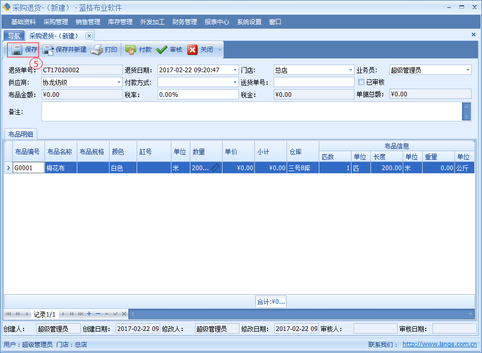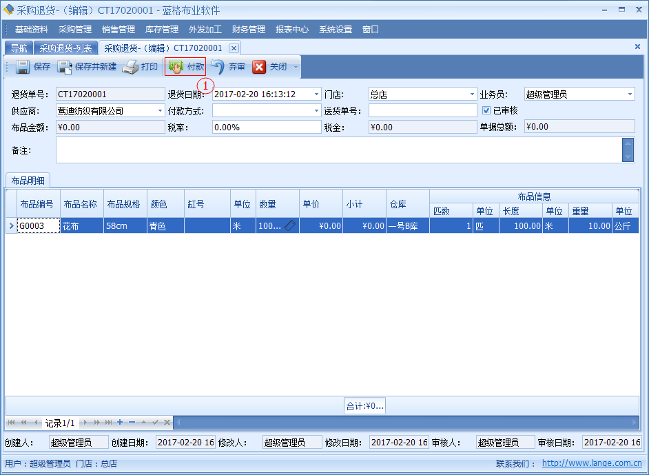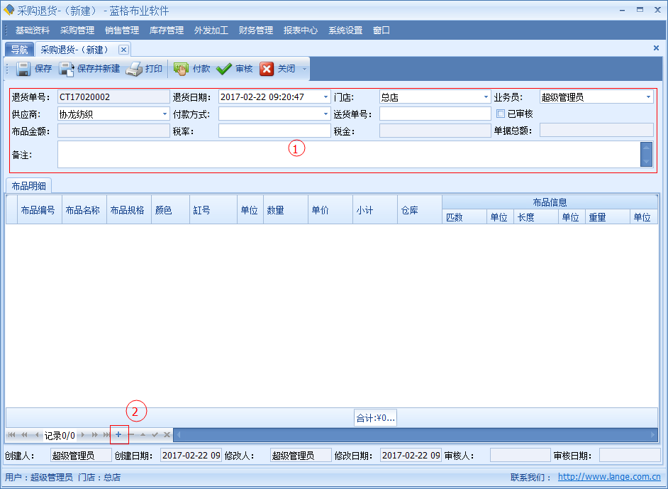 當(dāng)采購布品回來時發(fā)現(xiàn),布品中有破損、布品不對或者其他情況需要退貨給供應(yīng)商,并且取回來已經(jīng)支付給供應(yīng)商的布匹款項。傲藍(lán)好布業(yè)軟件中可以通過【采購?fù)素洝縼聿僮鳌2少復(fù)素泦螕?jù)包括退貨日期、要退貨的采購單、供應(yīng)商、倉庫、金額等信息。明細(xì)列表中包括單據(jù)要退貨的布品名稱、顏色、單位、數(shù)量、明細(xì)碼價格等詳細(xì)數(shù)據(jù)。