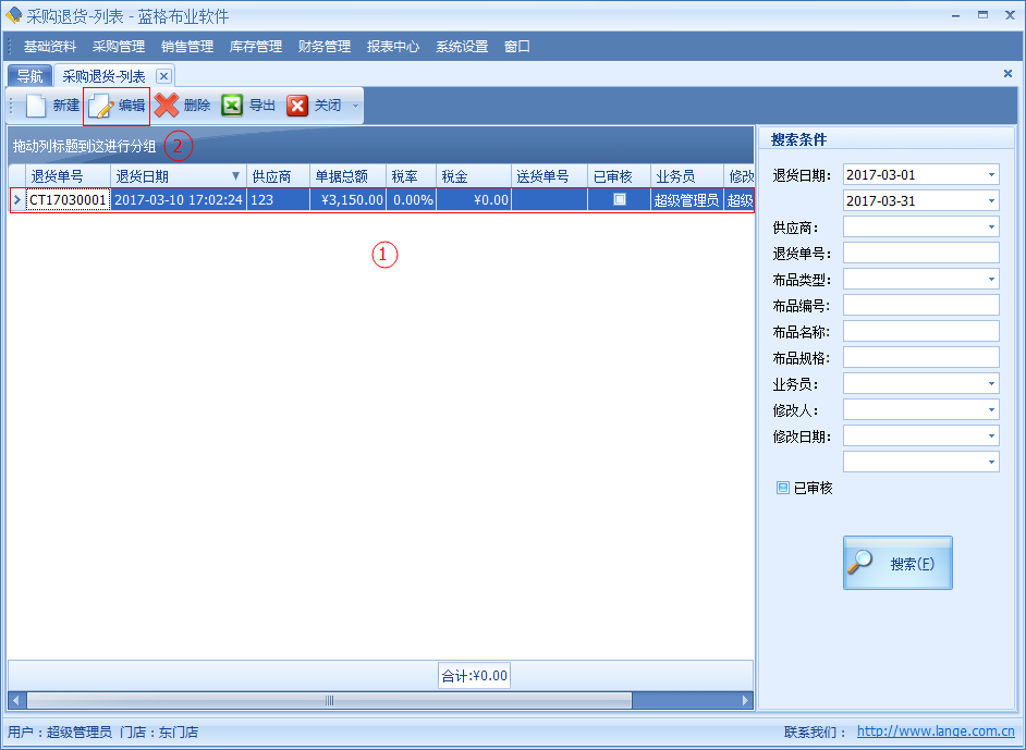 如需要對采購?fù)素浤骋粭l數(shù)據(jù)進(jìn)行修改的,通過采購?fù)素浟斜磉x中一條記錄點擊【編輯】按鈕,進(jìn)入
