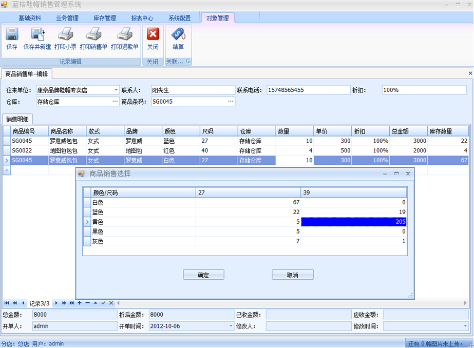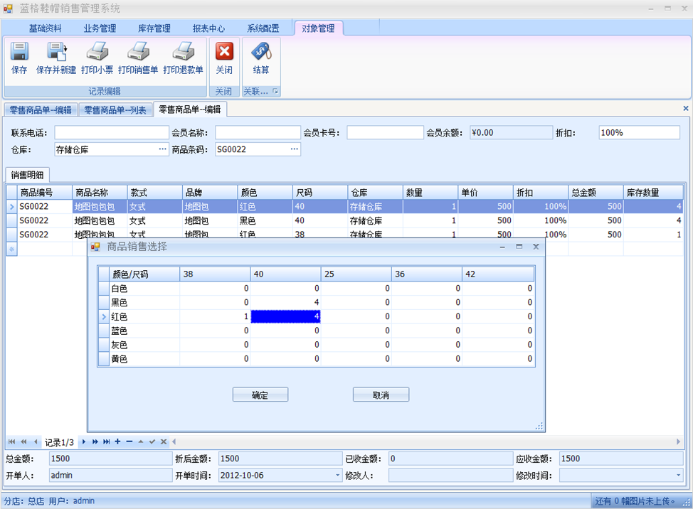 在上圖中點(diǎn)擊【新建】打開零售商品單據(jù)編輯界面。填寫好單據(jù)相關(guān)的信息。然后點(diǎn)擊【保存】這樣就把該零售商品錄入到傲藍(lán)鞋帽銷售管理系統(tǒng)中。當(dāng)在上圖中選擇一個(gè)單據(jù)點(diǎn)擊【編輯】,在該界面中會(huì)顯示選擇單據(jù)的詳細(xì)信息,修改其中的項(xiàng)目,然后點(diǎn)擊【保存】,單據(jù)信息就更新完成。在商品條碼框中輸入商品條碼然后按回車鍵,系統(tǒng)會(huì)自動(dòng)把該商品加入到銷售列表中,當(dāng)該條碼對(duì)應(yīng)多個(gè)商品時(shí),會(huì)彈出商品選擇框,選擇詳細(xì)的商品。如下圖所示: