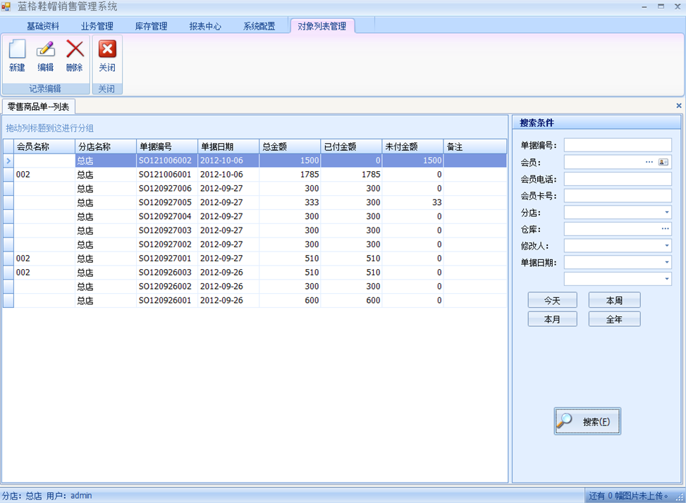 登錄傲藍(lán)鞋帽銷售管理系統(tǒng)后點(diǎn)擊【業(yè)務(wù)管理】->【零售列表】, 打開零售單據(jù)列表界面,該界面可以進(jìn)行查詢,查詢相關(guān)零售單的信息,雙擊該單據(jù)打開零售詳細(xì)信息界面。零售單據(jù)列表界面包括編輯零售單,刪除單據(jù)和建立新的單據(jù)三個(gè)功能。如下圖: