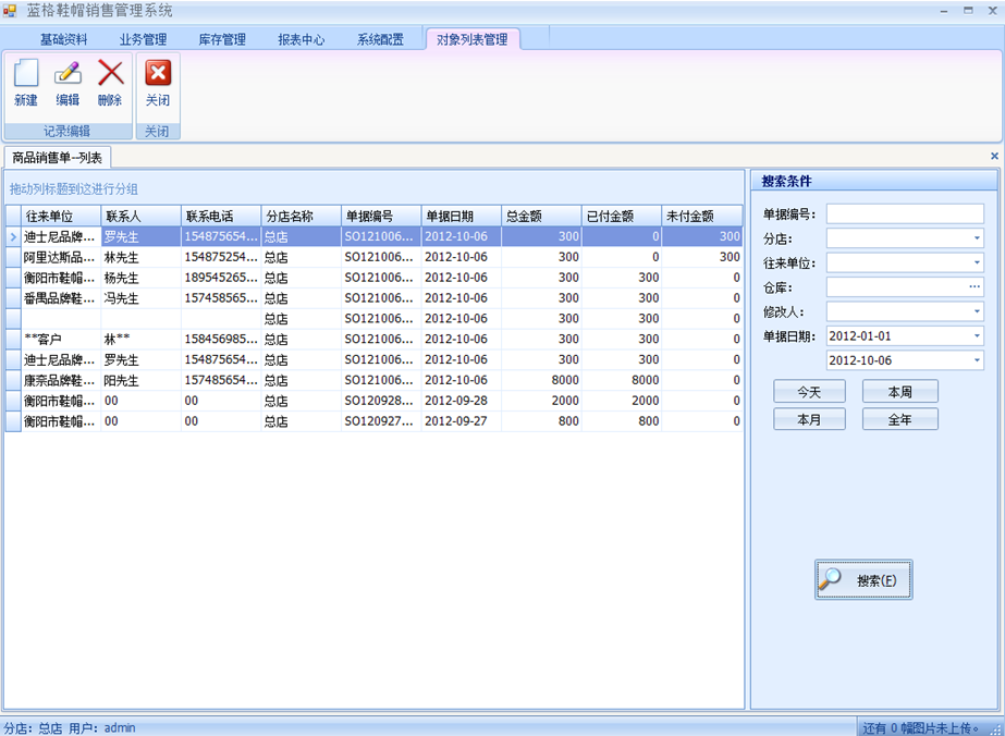 登錄傲藍(lán)鞋帽銷售管理軟件后點(diǎn)擊【業(yè)務(wù)管理】->【銷售列表】, 打開銷售單據(jù)列表界面,該界面可以進(jìn)行查詢傲藍(lán)鞋帽銷售管理軟件中之前錄入的相關(guān)銷售單信息,雙擊銷售單據(jù)打開銷售詳細(xì)信息界面。銷售單據(jù)列表界面包括編輯銷售單,刪除單據(jù)和建立新的單據(jù)三個(gè)功能。如下圖: