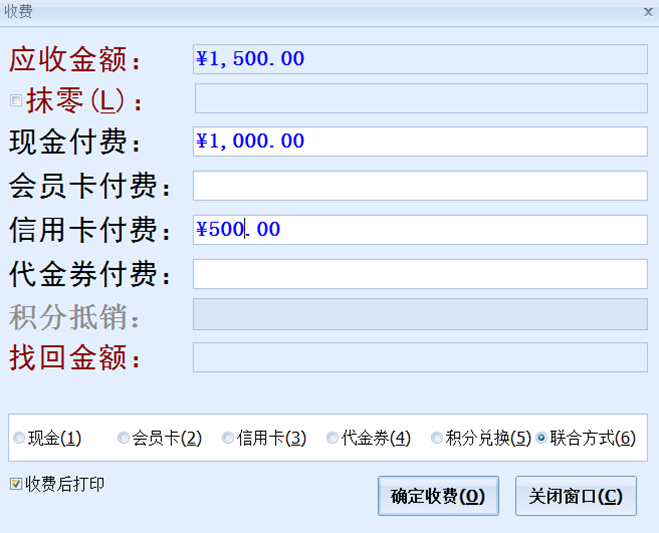 上圖數(shù)據(jù)保存好后,點(diǎn)擊【結(jié)算】,傲藍(lán)鞋帽銷售管理系統(tǒng)會(huì)彈出結(jié)算窗口,點(diǎn)擊【確定收費(fèi)】結(jié)算成功,點(diǎn)擊【關(guān)閉窗口】取消收費(fèi)。如下圖所示: