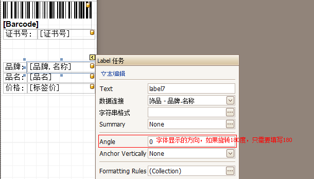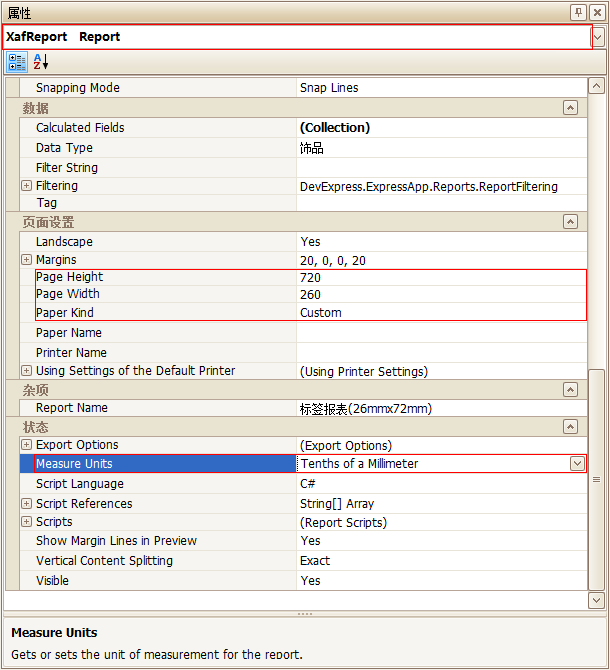 以72mm*26mm的報表來設(shè)計,在報表的屬性中設(shè)置Pager Kind:Custom;Page Height(報表高):720;Page Width(報表寬):260;Measure Units:Tenths of Milimeter(以毫米為單位),如下圖所示: