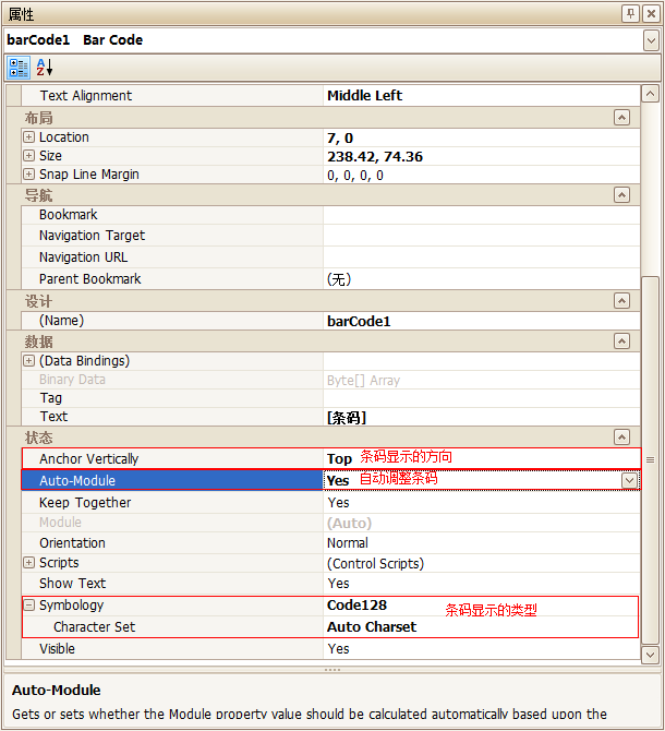 選擇條碼,屬性出現(xiàn)如圖,把Auto-Module屬性設(shè)置為yes,其它設(shè)置請看下圖: