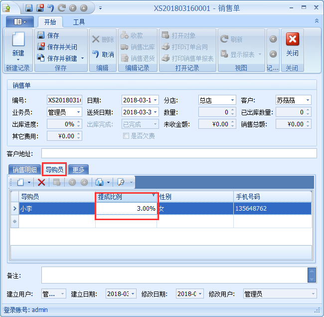 1、在銷售開單的同時,可以在銷售單上選擇相應的導購員,并設置業(yè)績提成比例,提成比例設置完成,系統(tǒng)將自動計算員工總的業(yè)績提成,如圖: