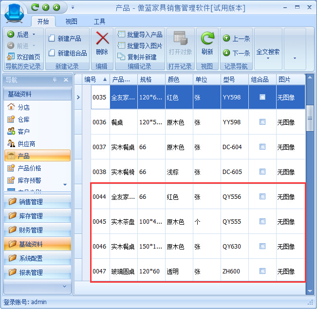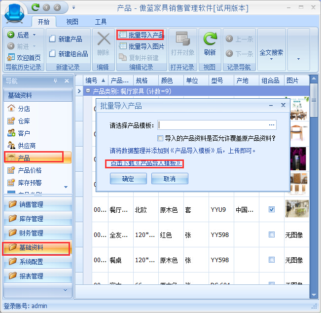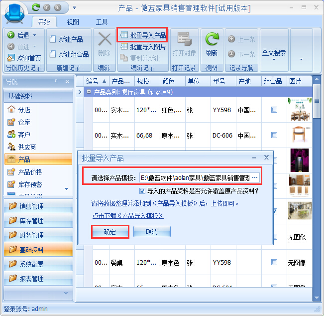 ⑤導入完成之后,傲藍家具店鋪收銀系統(tǒng)就會在產(chǎn)品資料中新增導入的產(chǎn)品,如圖: