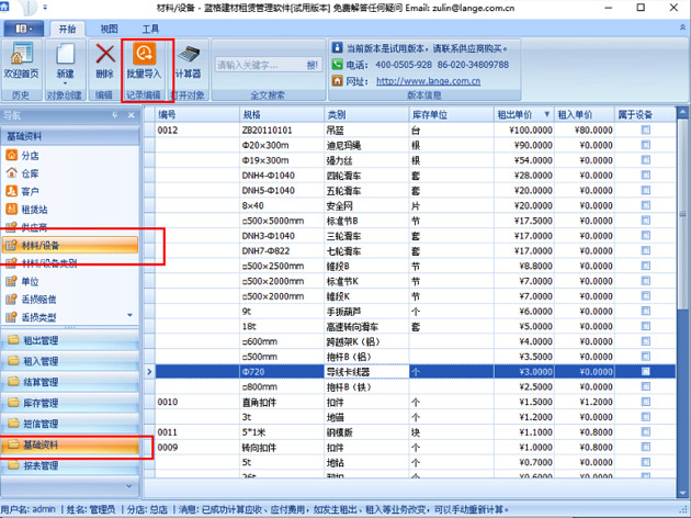 傲藍(lán)建筑租賃管理軟件可以從模板批量導(dǎo)入材料/設(shè)備的數(shù)據(jù),節(jié)省了客戶在剛試用軟件必須去一個個建立基礎(chǔ)資料的時間。