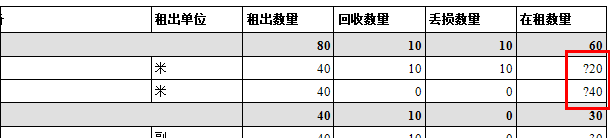 傲藍(lán)建筑租賃管理軟件當(dāng)租出材料是按類別租出的時候,查看租出情況報表時,該材料的在租數(shù)量就會有一個問號在數(shù)字的前面。初始使用的用戶很多時候會不理解問號的含義,如下圖所示: