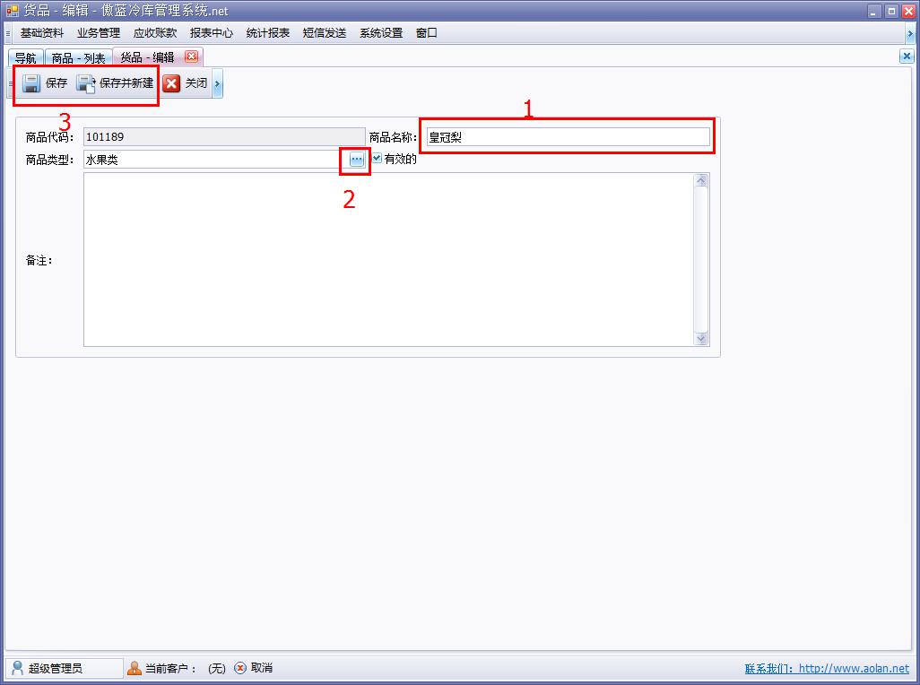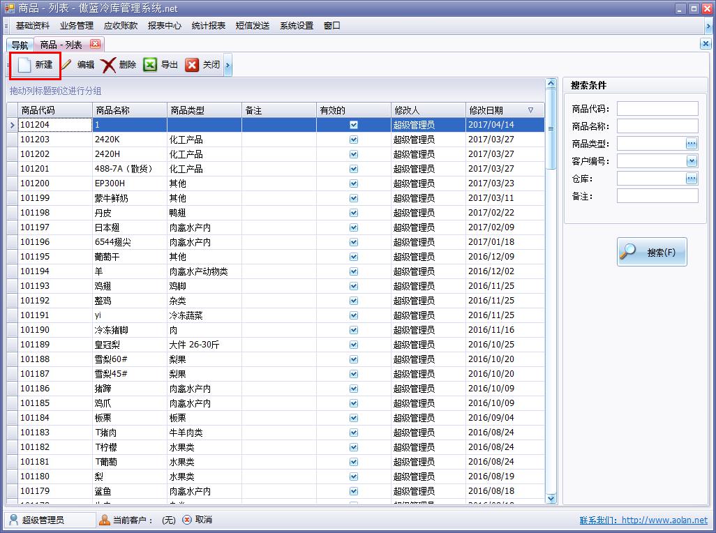 傲藍冷庫信息管理系統(tǒng)對于貨品資料的建檔管理,以便于業(yè)務操作時的選擇自動生成,例如入庫單操作,選擇所要入庫的商品即可,免除了人為重新錄入的繁瑣。