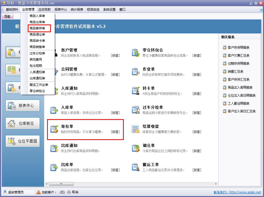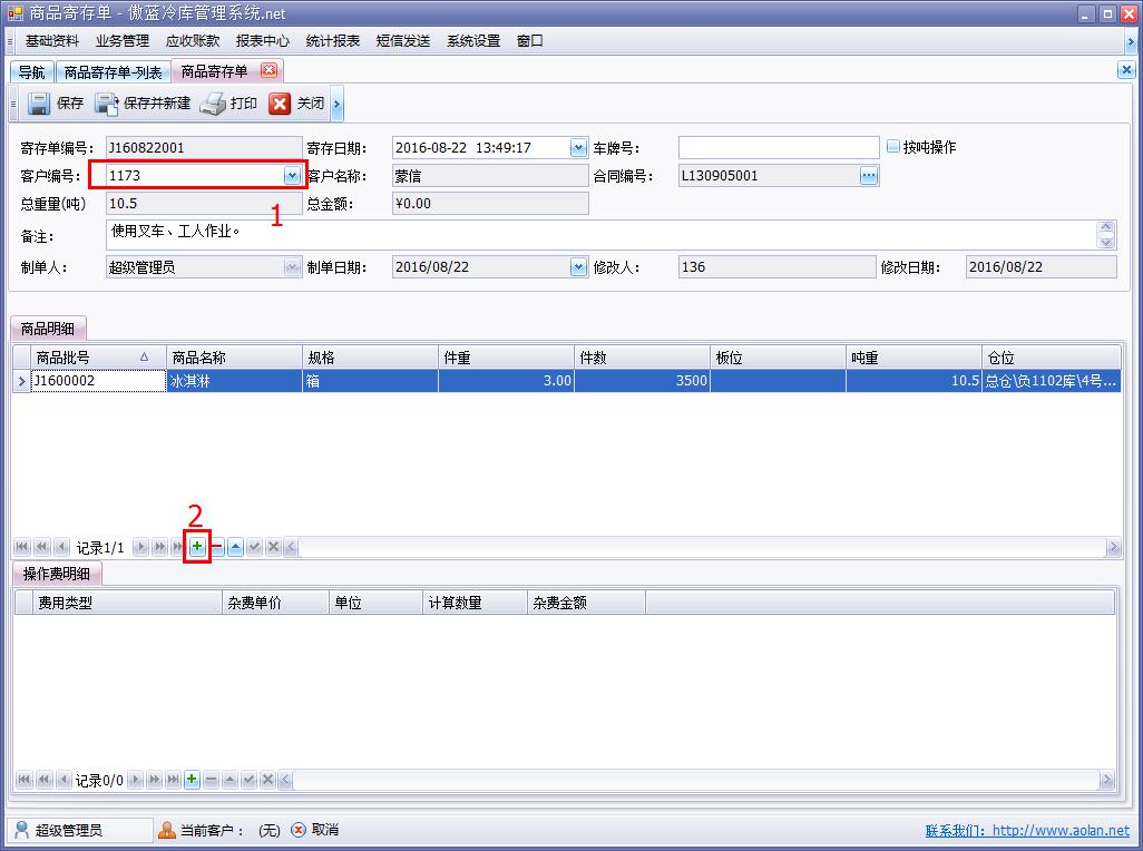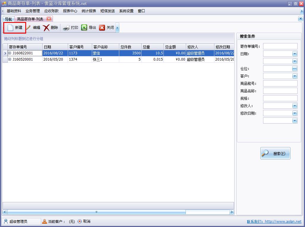 傲藍冷庫倉儲管理軟件寄存模塊即商品寄存單,界面與商品入庫單相似,冷庫倉儲管理軟件可分倉庫,按照商品批號或者商品編號進行入庫寄存。