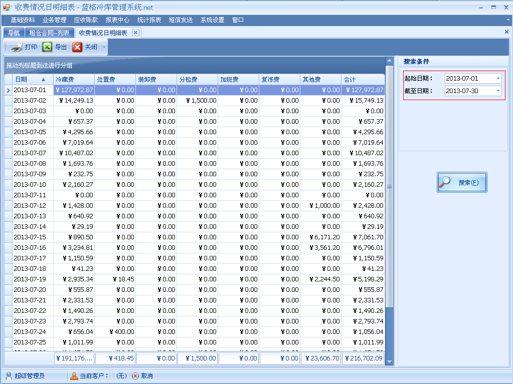 冷庫(kù)軟件收費(fèi)情況日明細(xì)表