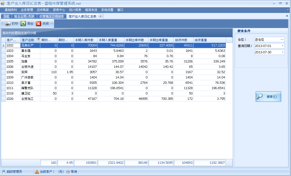 冷庫(kù)企業(yè)中,通常重視的是冷庫(kù)的營(yíng)業(yè)收入情況和冷庫(kù)庫(kù)存量的變動(dòng),傲藍(lán)冷庫(kù)信息管理系統(tǒng)能滿(mǎn)足冷庫(kù)業(yè)務(wù)中需要的需求。例如明確的了解冷庫(kù)每天的收入情況 ,系統(tǒng)中的報(bào)表中心,有個(gè)“收費(fèi)情況日明細(xì)報(bào)表”。