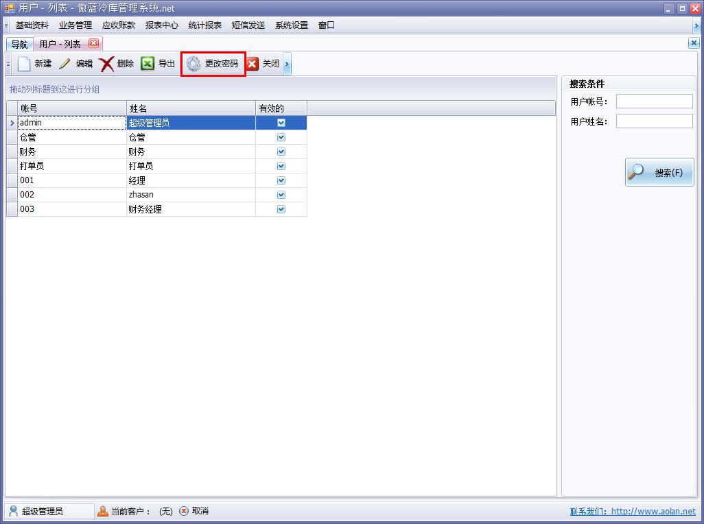 例如,系統(tǒng)的個別用戶離職,為了保障不必要的數(shù)據(jù)流失,或者避免惡意破壞冷庫管理軟件數(shù)據(jù)的情況出現(xiàn),管理員可修改此離職用戶的登錄密碼,性禁止此用戶登錄系統(tǒng)。