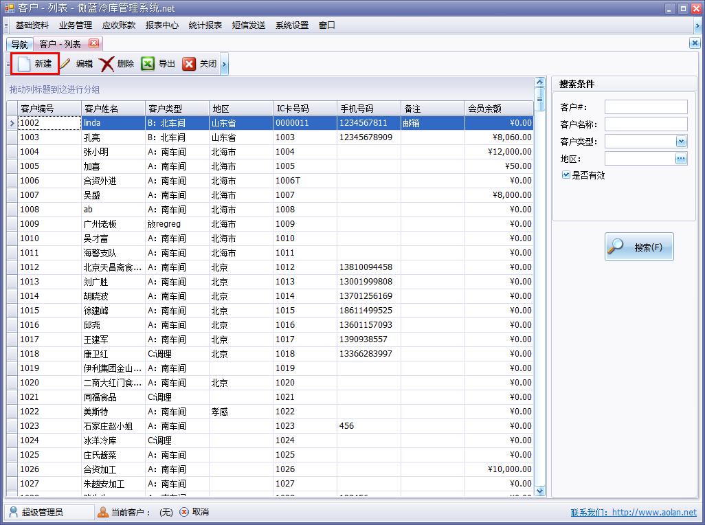 貨主資料管理是傲藍(lán)冷庫信息管理系統(tǒng)對于冷庫企業(yè)客戶資料進(jìn)行管理的功能,例如:客戶類型、客戶信譽(yù)級別、客戶公司性質(zhì)、客戶企業(yè)所在地區(qū)、客戶結(jié)算方式、結(jié)算使用的現(xiàn)金銀行等信息的管理。