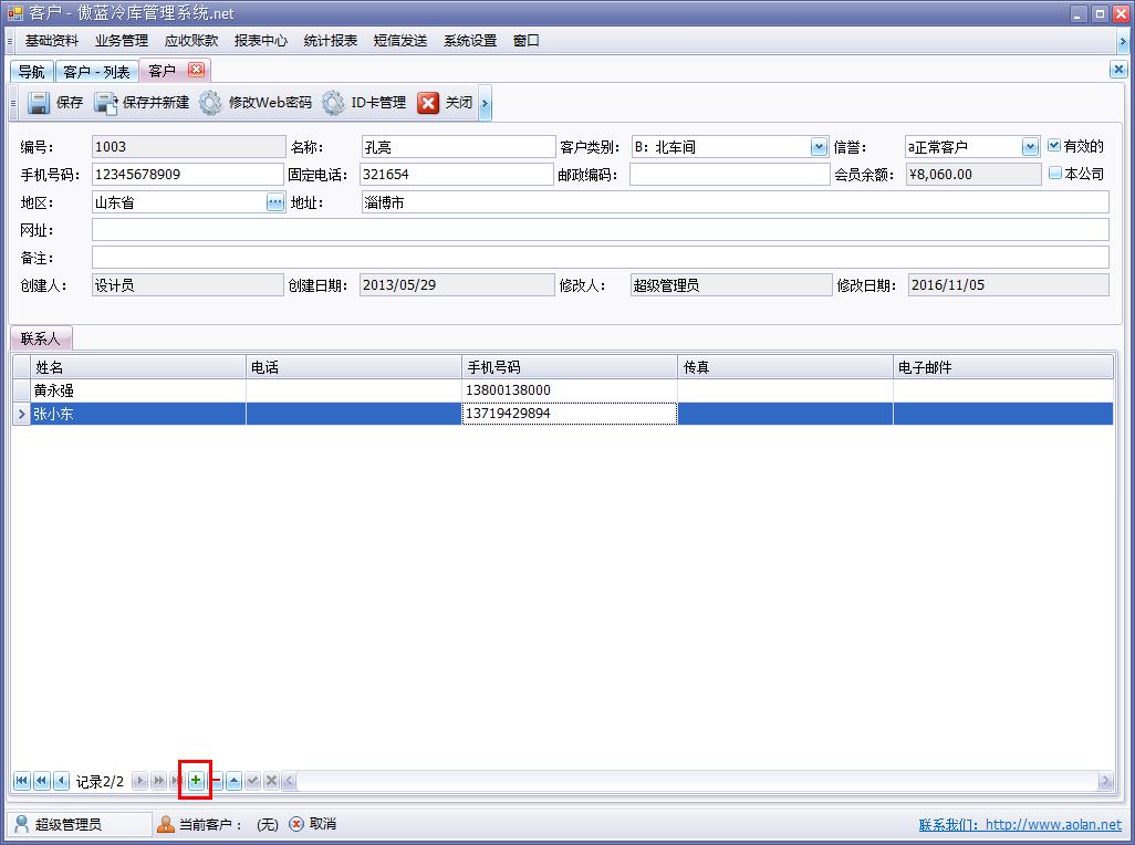 使用冷庫信息管理系統(tǒng)對客戶的一些基本信息進(jìn)行錄入處理,如客戶名稱、客戶地址以及多個(gè)聯(lián)系人信息的存儲,在業(yè)務(wù)處理過程中,遇到需要聯(lián)系客戶的情況,調(diào)出客戶資料,就可相對應(yīng)具體負(fù)責(zé)這項(xiàng)業(yè)務(wù)的聯(lián)系人,一對一地聯(lián)系溝通,避免了一些不必要的程序。