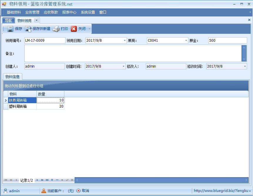 傲藍冷藏庫軟件單獨設(shè)立了物料領(lǐng)用模塊,管理果商寄存果品時會在冷庫中領(lǐng)用到的物料,領(lǐng)用時支付押金,冷庫工作人員在冷庫倉儲管理軟件上開領(lǐng)料單和押金條給果商。當果商歸還物料時把產(chǎn)生的費用和物料一起歸還。冷藏庫軟件物料領(lǐng)用單記錄領(lǐng)用日期,果商、押金、領(lǐng)用物料,通過單據(jù)或者果商姓名查詢領(lǐng)用記錄。
