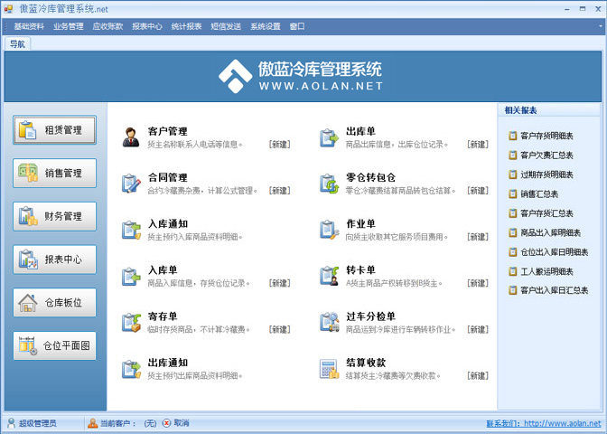 分店客戶端:分店電腦運行冷庫結(jié)算管理系統(tǒng)客戶端桌面軟件,具有網(wǎng)頁不可替代的操作的體驗和效率。傲藍冷庫結(jié)算管理系統(tǒng)精心設(shè)計了豐富的快捷方式,讓操作更快!OFFICE2007風格界面,時尚潮流!