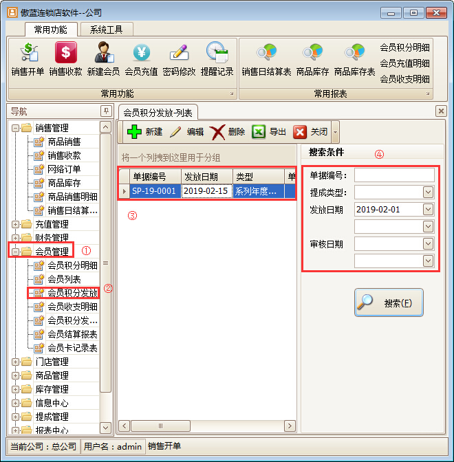 傲藍(lán)連鎖門店管理系統(tǒng)支持統(tǒng)一為某個(gè)門店的所有會(huì)員一件發(fā)放積分,具體操作如下: