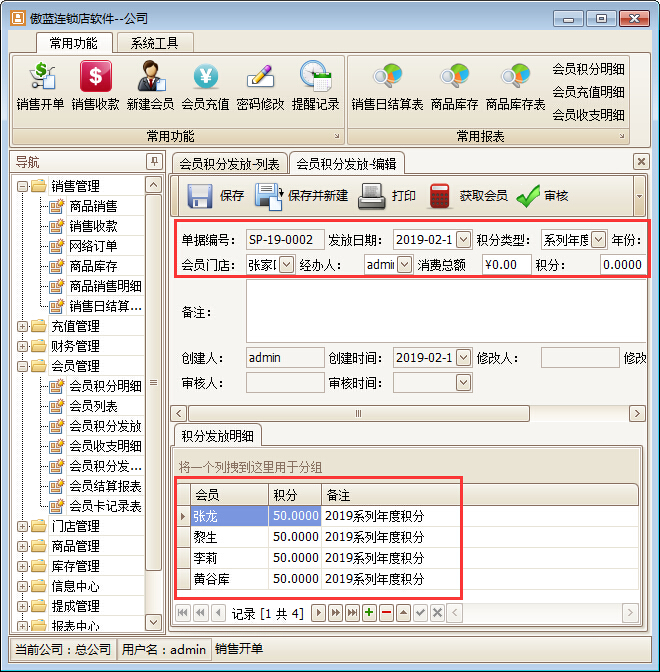 在會(huì)員積分發(fā)放列表界面上點(diǎn)擊【新建】打開新建界面。選擇一個(gè),然后點(diǎn)擊【編輯】可以打開該發(fā)放單編輯界面。信息新建或者編輯好之后,點(diǎn)擊【保存】更新軟件。如下圖: