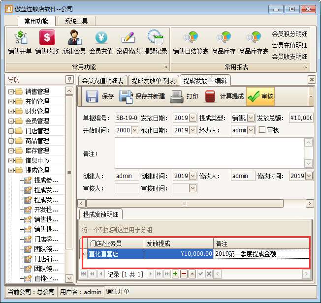 在該界面上點(diǎn)擊【新建】打開新建界面。選擇一個(gè),然后點(diǎn)擊【編輯】可以打開該提成單編輯界面。信息新建或者編輯好之后,點(diǎn)擊【保存】更新軟件。如下圖: