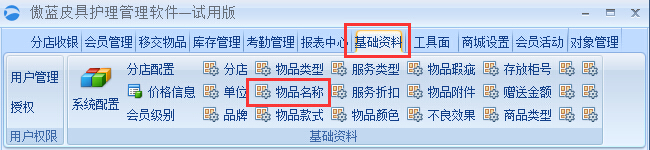 1、打開傲藍(lán)皮具護(hù)理店管理軟件點(diǎn)擊導(dǎo)航欄的【基礎(chǔ)資料】→【物品名稱】如圖: