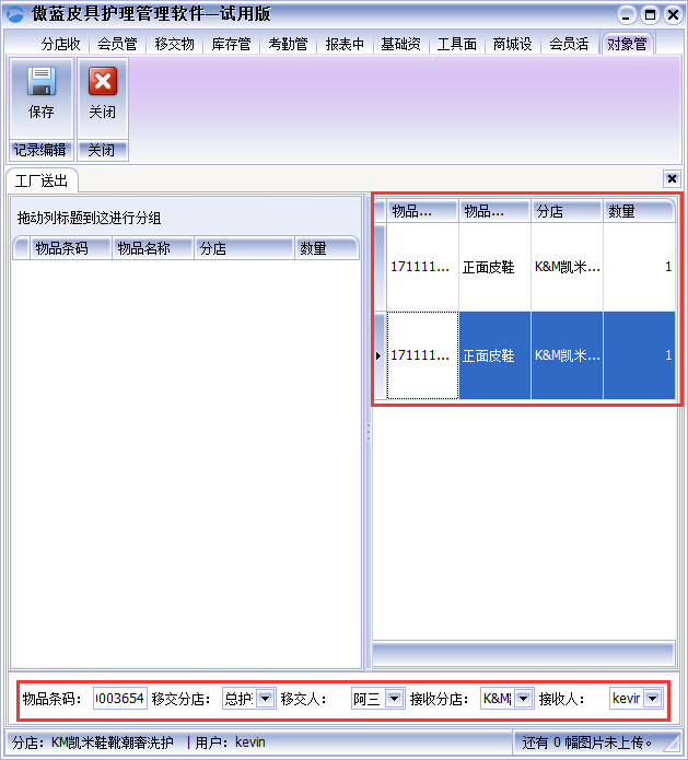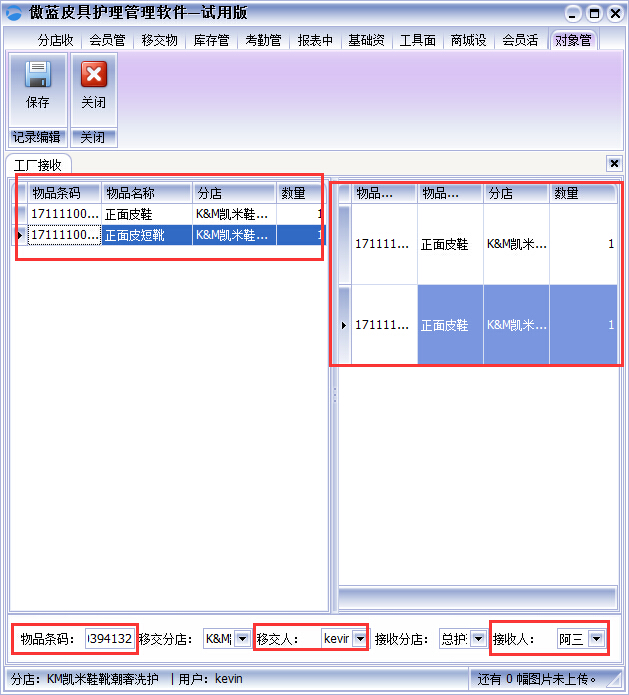 ①工廠接收”工廠接收到門店送來的皮革物品,在軟件“工廠接收”界面,掃描皮革物品的條碼進行接收皮革物品,通過傲藍皮具修理店收銀軟件左右兩個列表,可以很清晰的看出哪些皮革物品接收,哪些皮革物品未接收或漏接收,確認好接收人,保存即可,如圖: