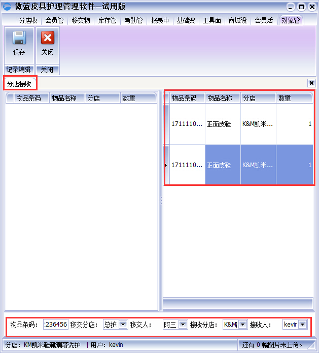 ③“分店接收”操作如上。傲藍皮革護理店管理軟件整個皮革物品移交流程,無需人工清點,提高皮革護理店工作效率,還有效的避免了多次移交可能出現(xiàn)的皮革物品丟失或錯送、漏送的情況,如圖: