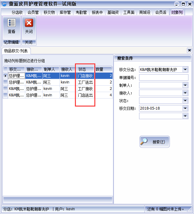 ④皮革物品移交流程完成之后,還可以在傲藍皮具修理店收銀軟件中【移交皮革物品】→【移交記錄】中的皮革物品移交列表中可以清晰的看到門店和工廠的皮革物品數(shù)量,皮革物品移交的當前狀態(tài),有多少皮革物品已經(jīng)洗好移交,還有多少在工廠皮革護理,使皮革護理店務管理更加簡潔清晰。皮革物品移交列表如圖: