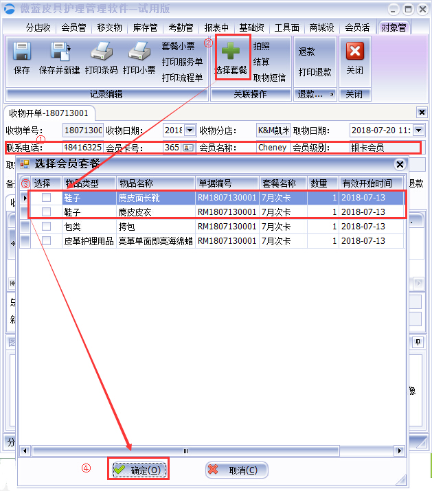 店員在傲藍(lán)皮具護理店系統(tǒng)給會員開單消費的具體操作步驟: