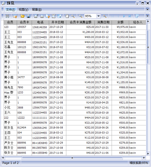 3、在皮具護理店會員管理軟件中會員消費報表中點擊上面的打印,就可以查看該報表的打印預覽,非常的方便 ,如圖: