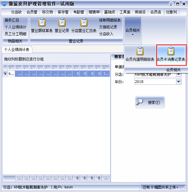 1、打開傲藍皮具護理門店管理軟件,點擊【報表中心】欄目,找到【會員相關(guān)】下的“會員卡消費記錄表”如圖: