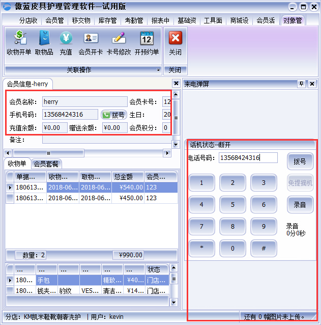 傲藍皮革保養(yǎng)店軟件電話預約操作,軟件支持接入來電寶,會員打電話到門店時,軟件會自動設別來電號碼,彈出會員的信息,無需再詢問來電客戶的信息再進行下一步工作,提高了工作效率。