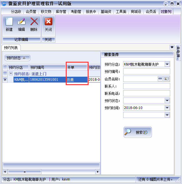 會員電話預約,員工可以在預約單列表點擊開單,系統(tǒng)自動帶入會員信息,無需再次填寫,取物開單便捷高效,如圖: