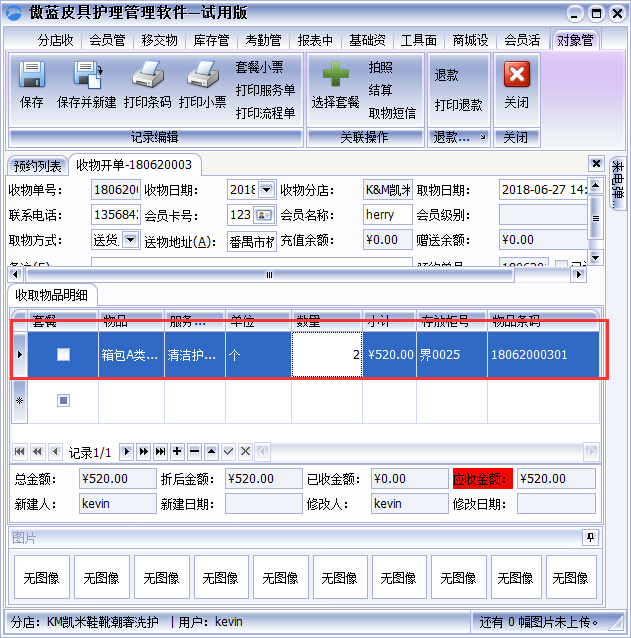 錄入相關的需要護理保養(yǎng)的皮革信息保存就可以完成該會員的收物開單,如圖: