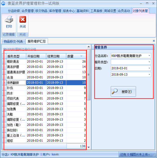 傲藍(lán)皮革養(yǎng)護(hù)店管理系統(tǒng)“服務(wù)維護(hù)匯總”報(bào)表為養(yǎng)護(hù)店提供各項(xiàng)服務(wù)在一個(gè)月、這半年等的銷售量,方便養(yǎng)護(hù)店的管理者對(duì)各項(xiàng)服務(wù)項(xiàng)目(比如:干洗,修補(bǔ),護(hù)理等)出現(xiàn)的次數(shù)進(jìn)行分析,得出哪些項(xiàng)目是顧客喜歡的,哪些是冷門的項(xiàng)目。對(duì)此制定出下一步的營銷計(jì)劃,或者優(yōu)惠活動(dòng)的方案,提高銷量,增加門店的收入。