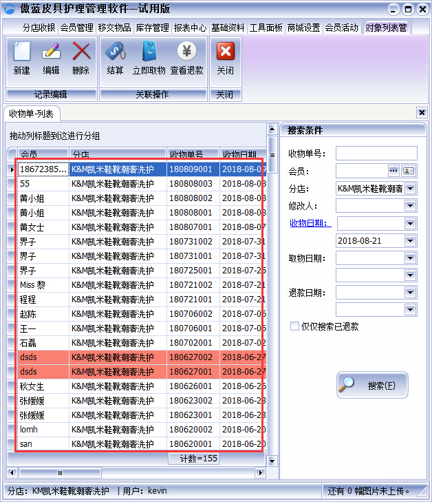收物單是會自動保存當前登錄皮具護理店,在收物物單列表界面中可以搜索每個分店的收物單以及收物單信息,雙擊皮具護理店連鎖管理軟件選擇單據(jù)就可以打開該收物單查看到衣物明細來記錄。