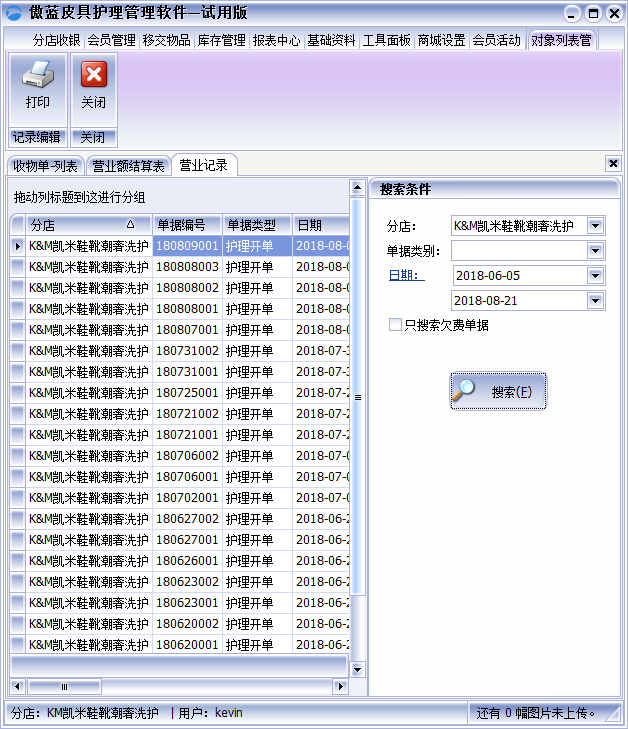 皮具護理店連鎖管理軟件在【報表中心】【營業(yè)記錄】表中可以根據(jù)分店搜索每個分店的單據(jù)付款信息。
