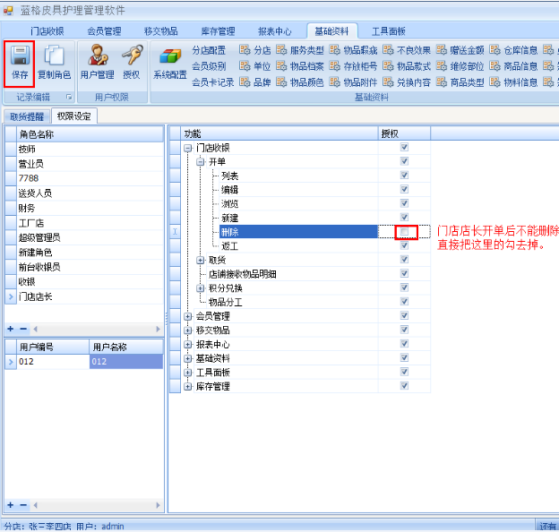4、在右邊的功能授權(quán)這里選擇相應(yīng)的單據(jù),分配權(quán)限,舉例,門店店長不允許開單刪除單據(jù),操作如下: