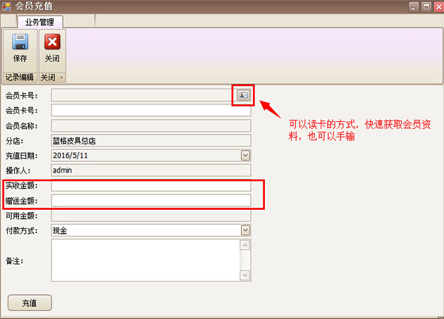 點(diǎn)擊【會(huì)員充值】進(jìn)入充值界面,可以通過(guò)讀卡的方式快速的獲取會(huì)員資料,也可以手動(dòng)輸入,靈活的操作的界面,沖值金額,贈(zèng)送金額,付款方式填寫(xiě)好,保存