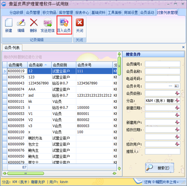 批量導入會員操作:在【會員列表】支持批量【導入會員】,將會員資料錄入到傲藍皮具護理軟件會員模板里,點擊【導入會員】,找到模板打開,導入成功。