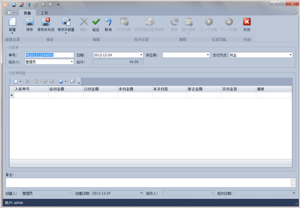 1打開傲藍汽車配件銷售店管理軟件【庫存管理】——【付款單】,出現(xiàn)主界面如下所示: